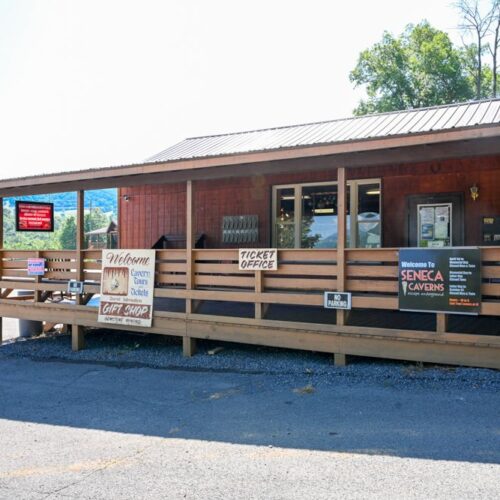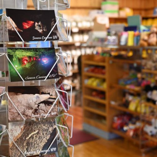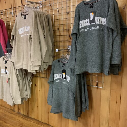 Apparel: T-shirts, hats, and hoodies featuring Seneca Caverns branding.