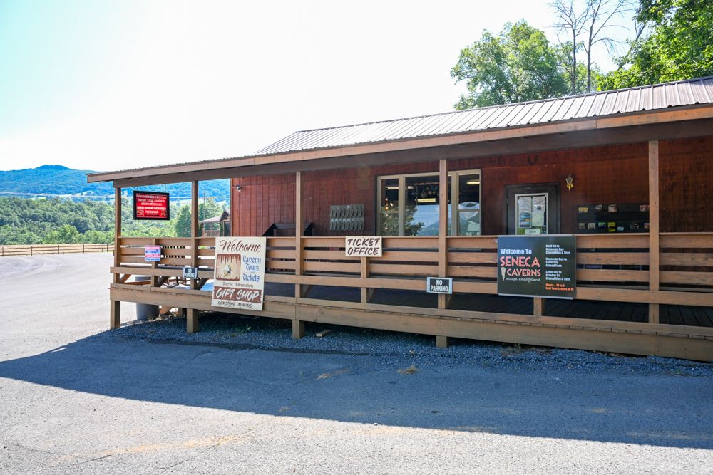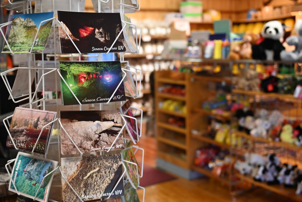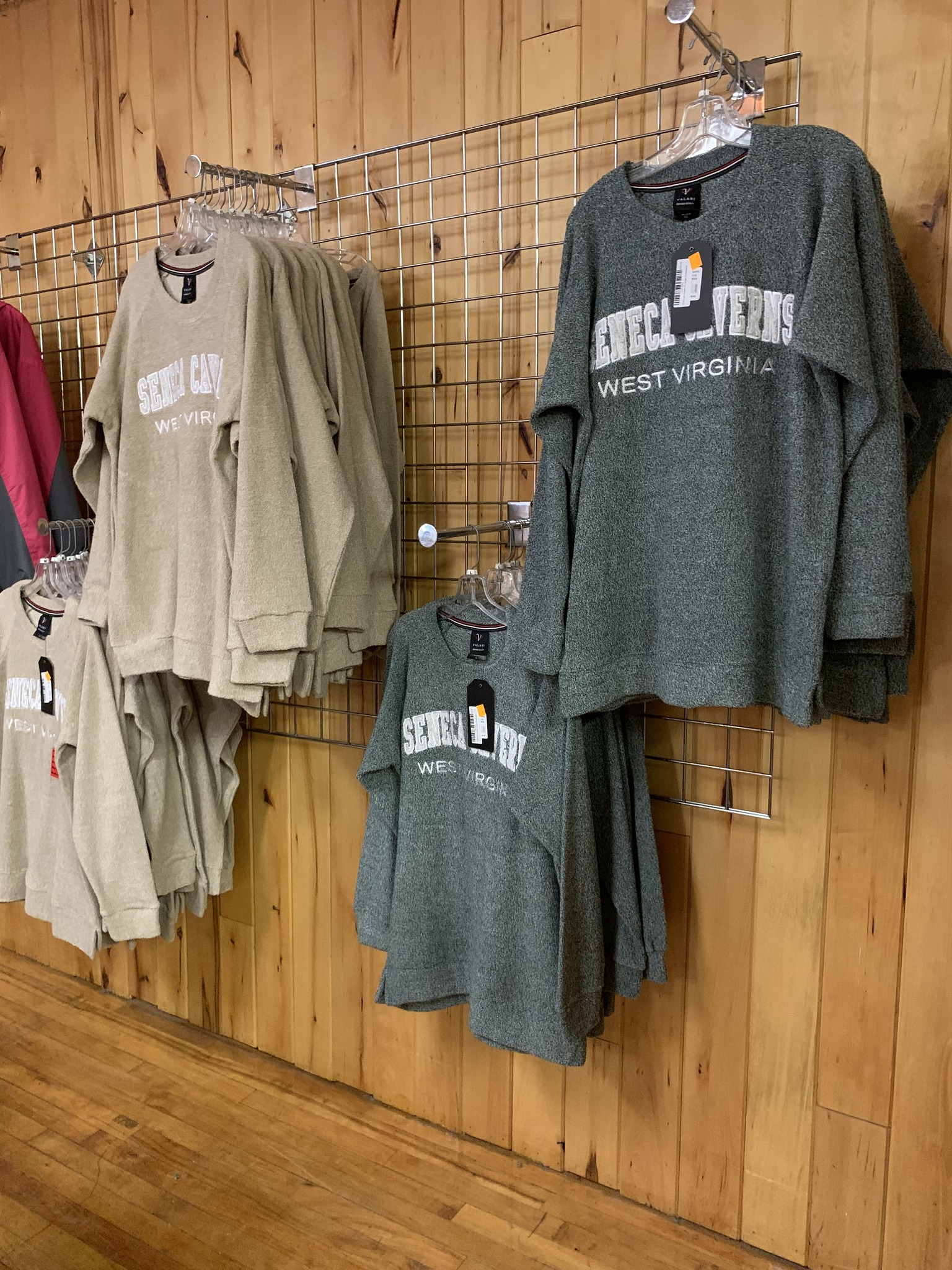 Apparel: T-shirts, hats, and hoodies featuring Seneca Caverns branding.